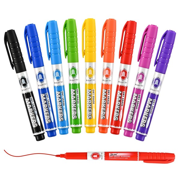 SUIN 9 Colour Low-Odour Whiteboard Markers - Slimline Medium Fine Tip for Home, Work, School (Pack of 9)