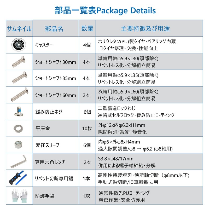 - Replacement kit includes 3 bolt lengths. 60mm axle is worn on two wheels. Extra parts can be stored in your suitcase