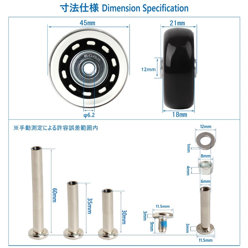 - Tire kit includes: 4 casters (diameter 1.8 inches (45 mm), 10 screws, 10 bolts (axle 30 mm x 4, 35 mm x 4, 60 mm x 2), 8 washers, 4 guide pipes, 2 wrenches