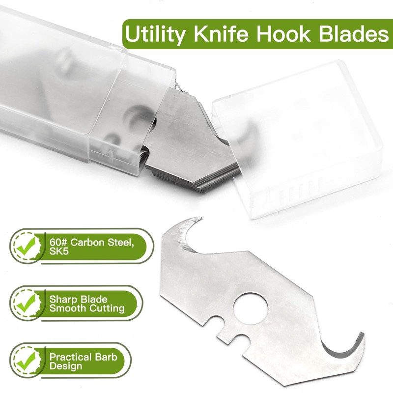 - Solid & Quality: Made of 60# carbon steel SK5, the hook utility knife blades are high-strength, sturdy and wear-resistant.
