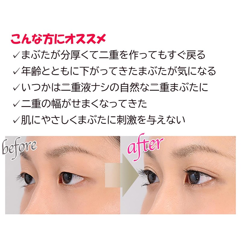 Scarlet eye horn is popular even for those with thick eyelids and thick eyelids that become double eyelids with decayed eye patches. 3 Million Lovers 92 Years of history, "Double Eyelids Without Surgery" A newly developed double eyelid makeup product with a focus on thinning eyelid fat. Double eyelids with decayed patches for quick addiction. When you have a double addiction, you won't have to use an eye horn anymore as you do it. Natural double eyelids that won't fall apart or snap your eyes will be yours forever! Even though we have used a white rubber glue double liquid until now, it will peel off quickly, and you will find yourself troubled with the worries of ballet barrel. Of course, it is also safe for water and sweat. This double eyelid shaping product is made with herbs and vitamins, so it is gentle on the skin and safe for those with sensitive skin.