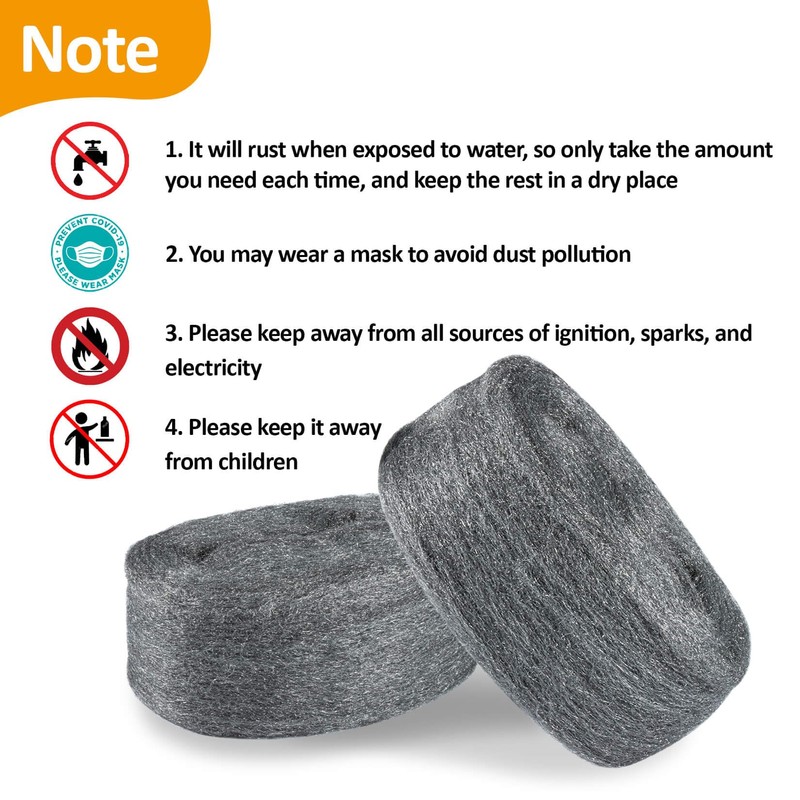 - 【Important Advice】Sukh Steel Wool 0000 is made of fine steel wire, there will be steel dust when unpacked. And it is not made of stainless steel so it may rust when exposed to water. Please store the remaining parts in a dry place.