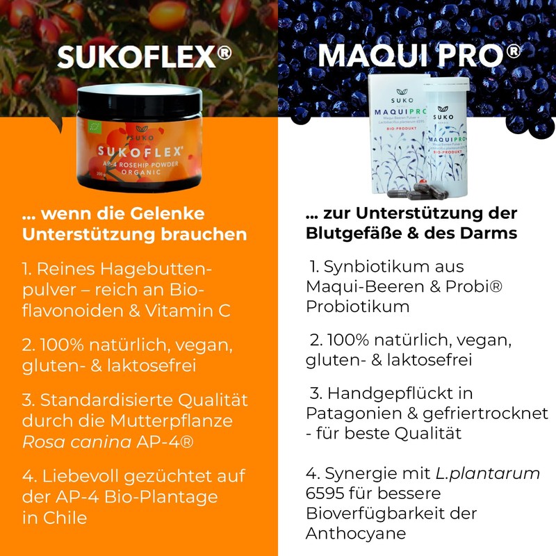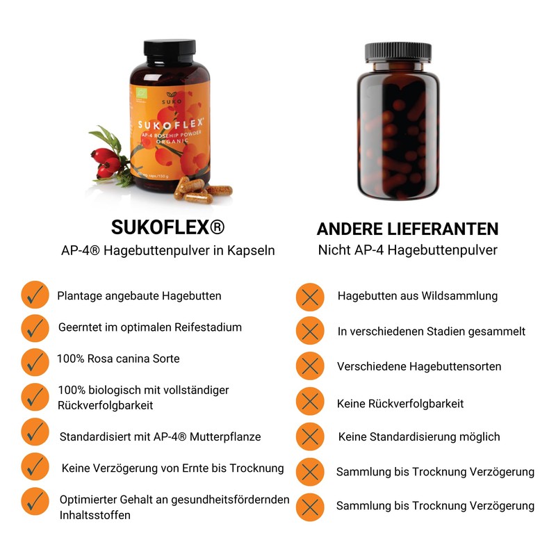 - Unique origin: Sukoflex rose hip powder, made from the Rosa Canina AP-4 variety on its own organic plantations in Chile, is then packed in capsules. The AP-4 mother plant was selected in a research project. The volcanic soil and unique climate in southern Chile offer optimal conditions, and the fruits are harvested in optimal ripeness. Made in Germany to the highest quality standard: FSSC 22000 certified operation.