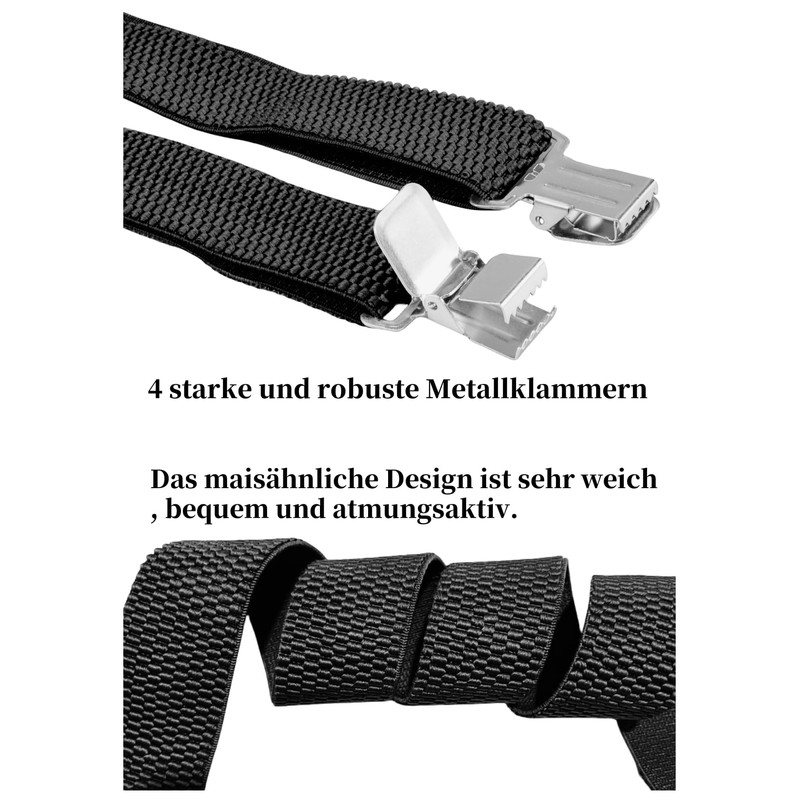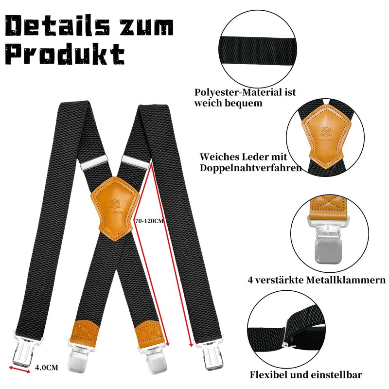 SULIHUA Braces for Men, Men's Shoulder Strap, 4 cm Width, Long X-shaped, Adjustable and Elastic, 4 Strong and Robust Metal Clips for Men's and Women's Work Clothing, Jeans, Trousers, Jumpsuit, black