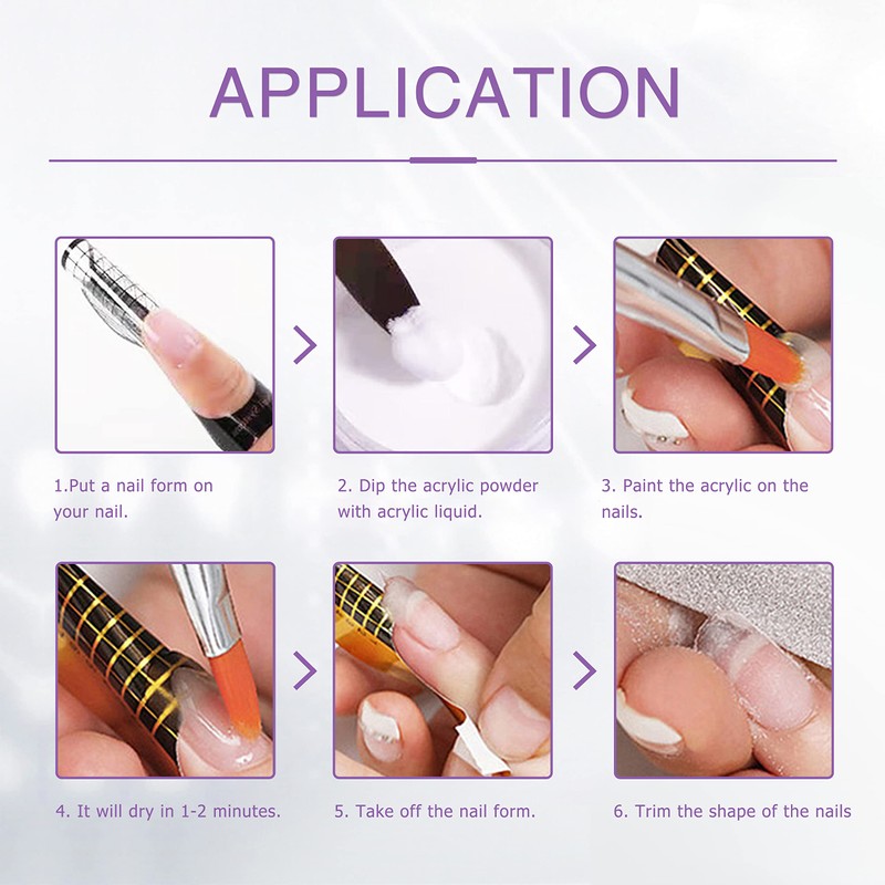 ✿Acrylic Powder And Acrylic Monomer Liquid Can Be Used Together To Extend Your Nails, And Can Also Be Used For Carving And Nail Decoration. This Acrylic Powder Is More Delicate And Has a Better Application Effect. With Acrylic Monomers, It Strengthens Your Nail Extensions And Keeps Them Smooth When Applied.