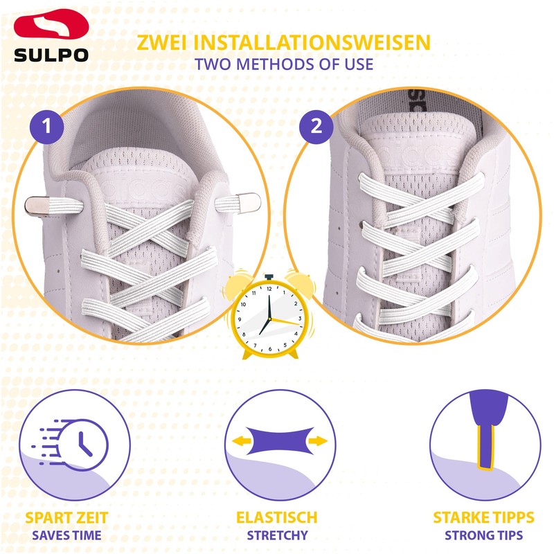 SULPO 2 Pairs of Laces without Tying - Chic Quick Lacing System - Elastic Shoelaces - Replacement Shoelaces - Shoelaces without Loops - Elastic Shoelaces, White