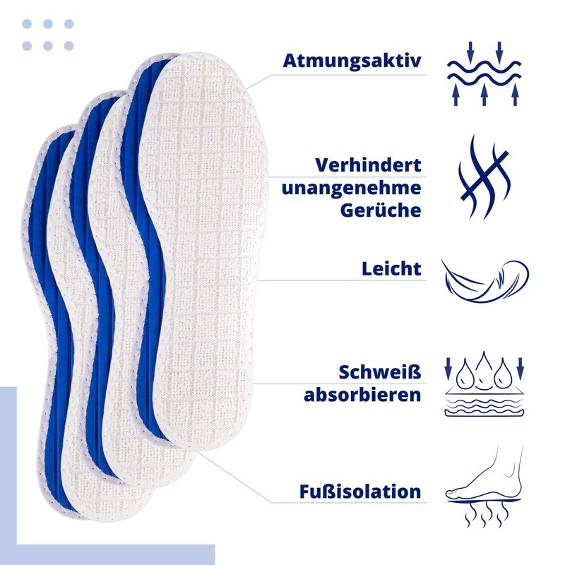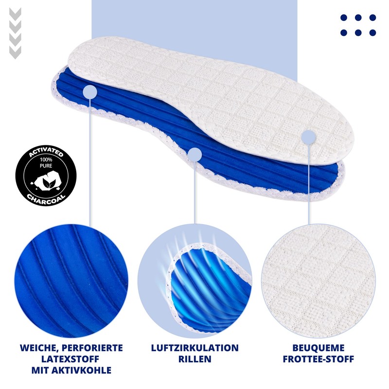 - Exceptional quality - The insoles consist of up to three layers. Blue - soaked with fresh fragrance, black - foam with activated carbon and white - made of bamboo terry. These materials are extremely durable and resistant to washing at low temperatures.