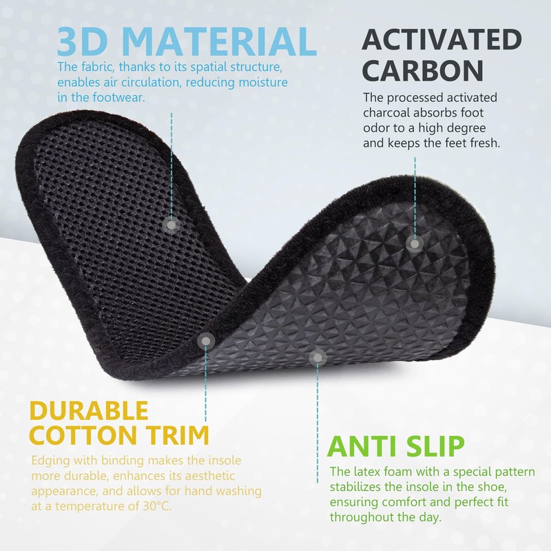 - Eliminate foot odour easily: say goodbye to embarrassing smell with our innovative antibacterial activated carbon layer, which ensures that your feet smell fresh and clean all day long.