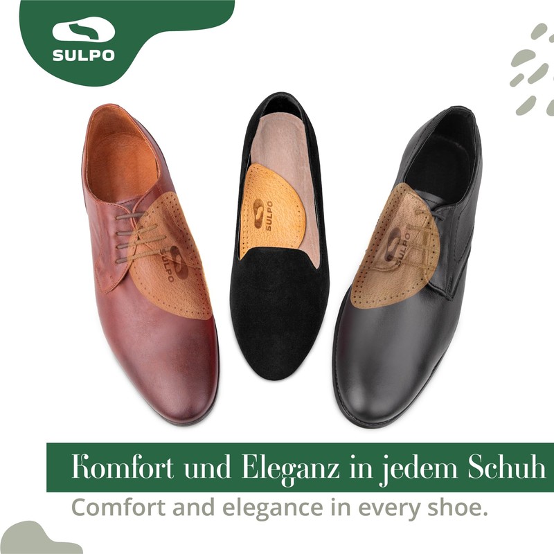 - Comfort and support: with the splayfoot pad, the SULPO insoles offer unparalleled comfort and effective support for the forefoot. The longitudinal arch support helps with splayfoot discomfort and gives your foot healthy support, especially with a fallen arches. The pecari leather top is vegetable-tanned. In this way, this special leather ensures very good compatibility. The SULPO pads are handmade in the European Union. They are reusable.