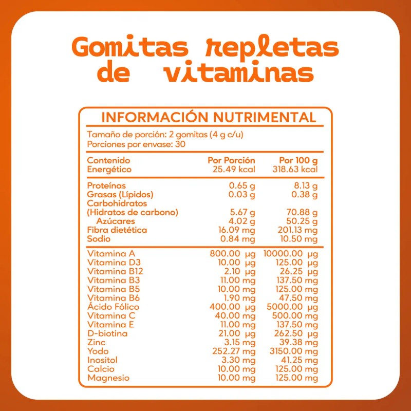 Diseñadas especialmente para niños, estas gomitas multivitamínicas son una forma divertida de complementar su alimentación diaria y apoyar su desarrollo.