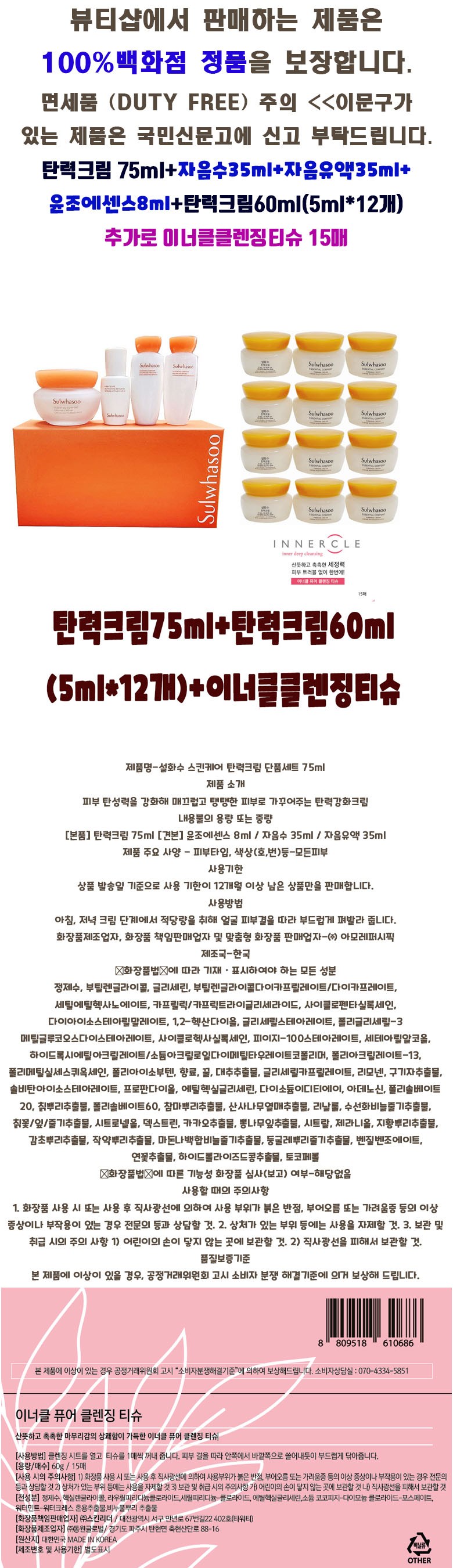 Sulwhasoo [Genuine] Sulwhasoo Elastic Cream 75ml + Elastic Cream 60ml (5ml*12 pieces) + Inner Tissue, 1 Set 1 Set_Elastic Cream 75ml + Elastic Cream 5*12 + Inner Tissue Elastic Cream 75ml + Elastic Cream 5*12 + Inner clitsch / 설화수 [정품] 설화수 탄력크림 75ml + 탄력크림 60ml (5ml*12개) + 이너클티슈, 1세트1세트_탄력크림75ml+탄력크림5*12+이너클티슈탄력크림75ml+탄력크림5*12+이너클티슈