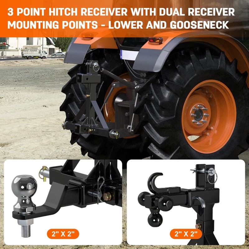 - 3 Point Hitch with Dual Receiver: 2" receiver mounts top and bottom, Hitch attachment acts as a stabilizer and works on a variety of 2-inch hitches; Top receiver mount for goose neck trailers or accessory items