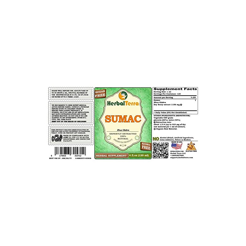 Sumac (Rhus glabra) Glycerite, Dried Berries Alcohol-FREE Liquid Extract (Brand name: HerbalTerra, Proudly made in USA) 2x4 fl.oz (2x120 ml)