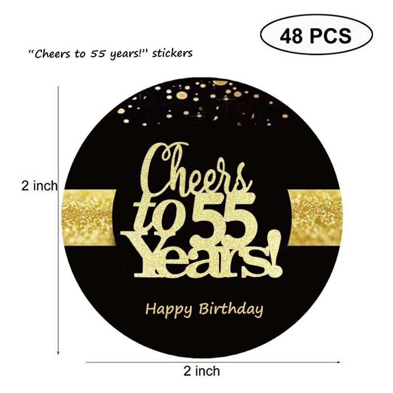 - ★BIRTHDAY STICKERS: 48-pack Cheers to 55 birthday stickers, 2" Diameter in glossy circles, each shows "Cheers to 55" and words "Happy birthday"