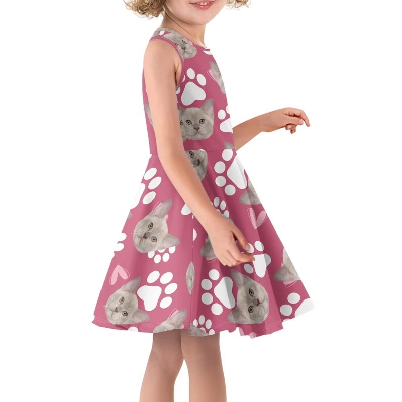 Summer Dress Pink Paw Cute Cats Print Soft Girls Custom Dress A Line High Waist Swing Sleeveless Tank Dress Beach Party Sundress Little Girls Midi Twirly Flowy Dance Dress for 5-6 Years Old