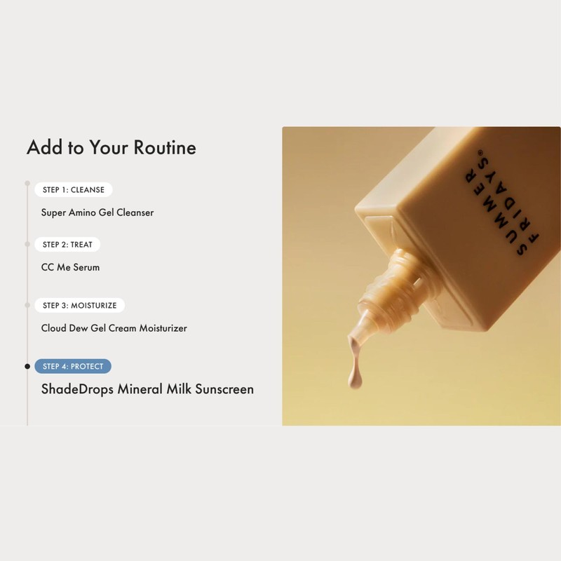 - ShadeDrops Broad Spectrum SPF?30 C This mineral milk sunscreen glides on like a serum, delivering lightweight zinc oxide protection with squalane, chamomile and antioxidants for a soft, hydrated finish without heaviness.