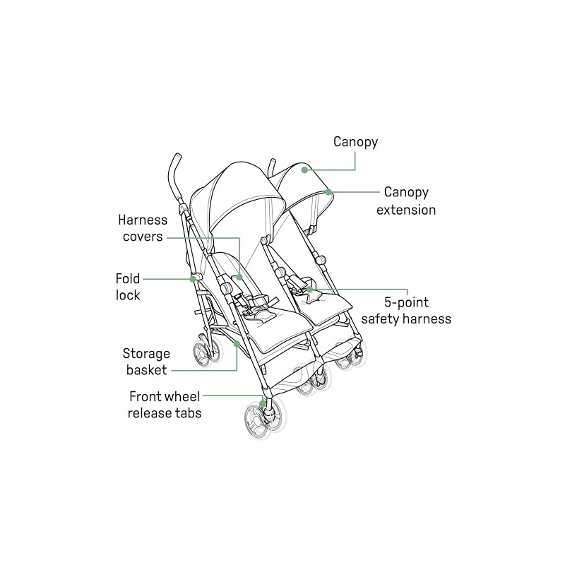 Double your adventures without doubling your load with the Summer by Ingenuity 3Dlite Double Convenience Stroller. Weighing under 22 pounds, this lightweight stroller from a Top Manufacturer of Umbrella Strollers* features an easy-to-fold compact frame that makes it easy to stow and go with a convenient carry handle. Little ones will feel comfortable and secure thanks to individual full-size padded seats with multi-position recline (maximum weight for each seat: 50 pounds), 5-point safety harnesses, and pop-out sun visors. Parents will enjoy a cup holder plus tons of storage, with two storage pouches as well as two extra-large storage baskets. Anti-shock front wheels provide a smooth ride while lockable rear wheels give you a sense of security while you're out and about. Whether you're taking a spin around the neighborhood or strolling through the airport, the 3Dlite is the ideal double stroller for travel or every day. (*Circana, Retailer Tracking Service, U.S., Strollers-Umbrella, Ranked #2, dollar sales, YTD November 2023)