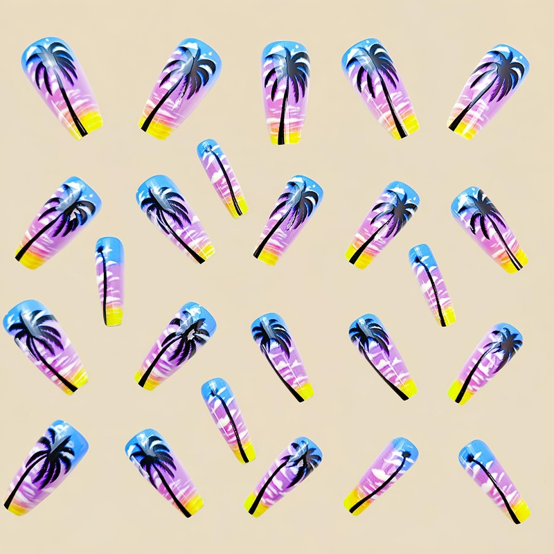 Summer Press on Nails Long Coffin Fake Nails Gradient Glue on Nails Coconut Tree Stick on Nails Colorful Artificial Nails Full Cover False Nails Glossy Acrylic Nails Reusable Nails Kit for Women Girls