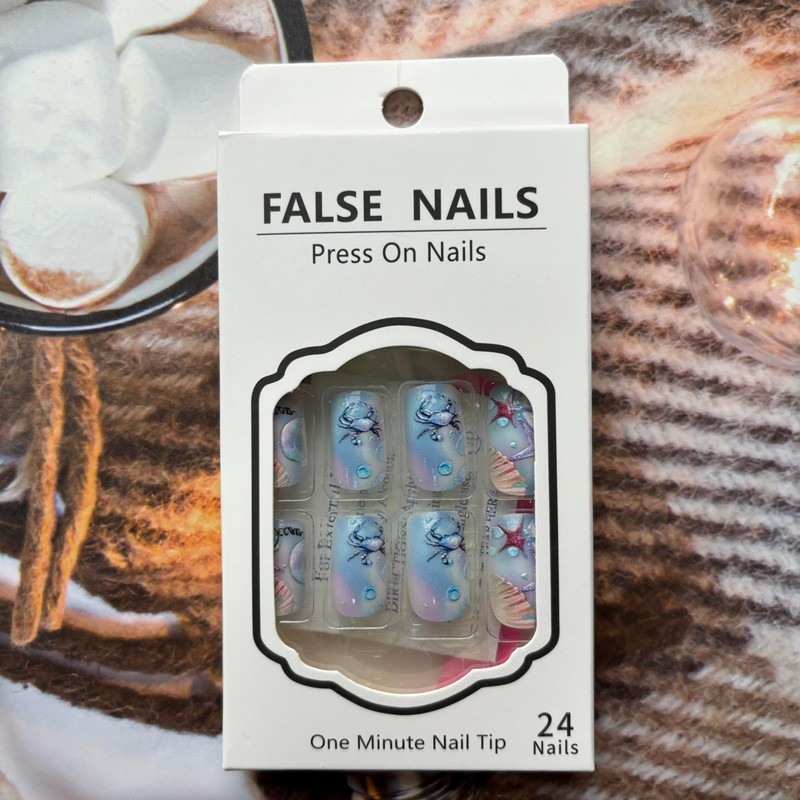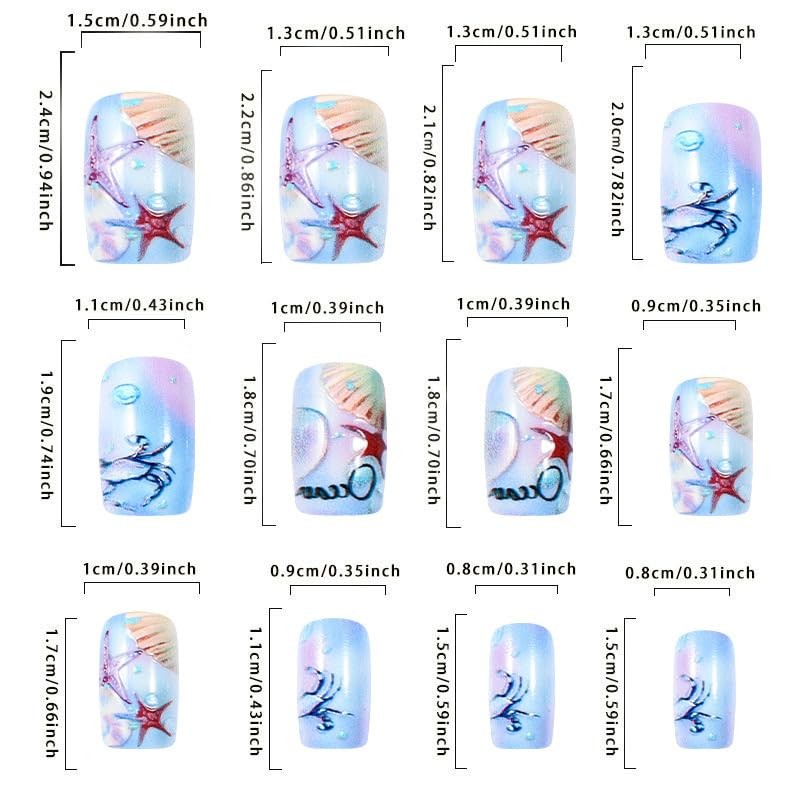 Summer Press on Nails Medium Square Fake Nails Blue False Nails with Starfish Seashell Designs Crab Glue on Nails Spring Stick on Nails Full Cover Cute Acrylic Nails Matte Artificial Nails