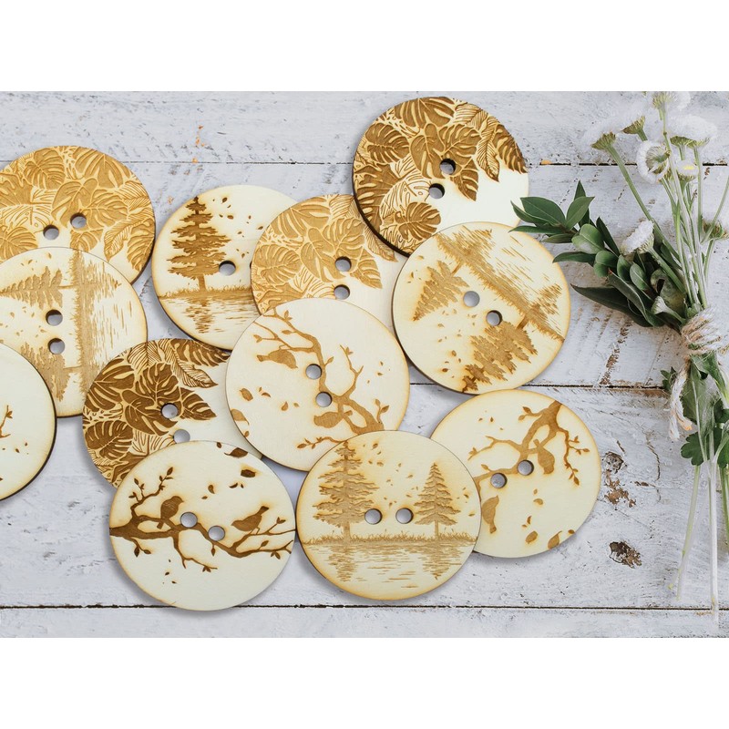 - The buttons are made of unfinished plywood. The brown tone of the engraving surface may vary due to the plywood material underneath.