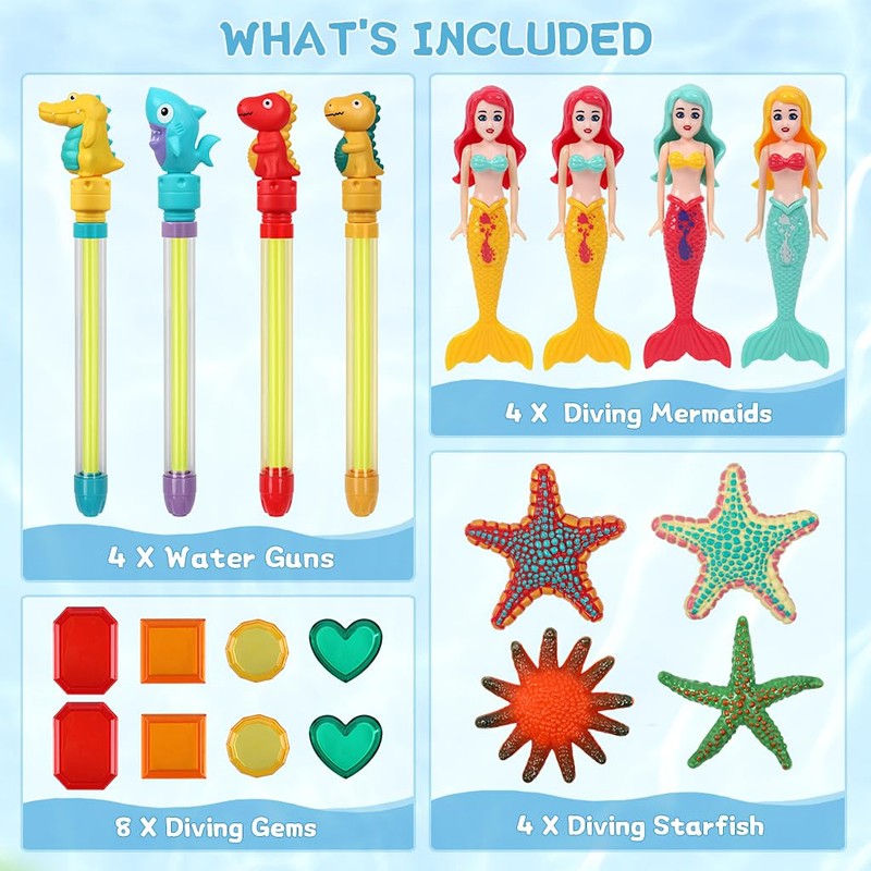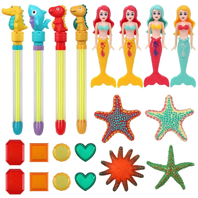 - PERFECT SUMMER WATER TOYS:This water toy set contains 4 packs cartoon animal water guns and 16 pcs beautiful diving toys. The water guns have 3 unique designs: shark, crocodile and dinosaur. And the diving toys include 4 mermaids, 4 starfish and 8 gems. These diverse water toys can bring various fun experiences to your child.