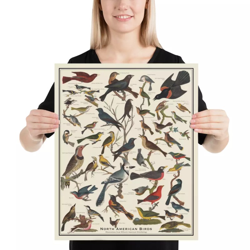 Museum-quality 16” x 20” bird identification poster with antique bird images from Wilson’s American Ornithology in earth tone colors. Includes bird names as specified by Wilson. The poster is made on thick and durable matte paper. Add a wonderful accent to your room and office with this poster that is sure to brighten any environment.