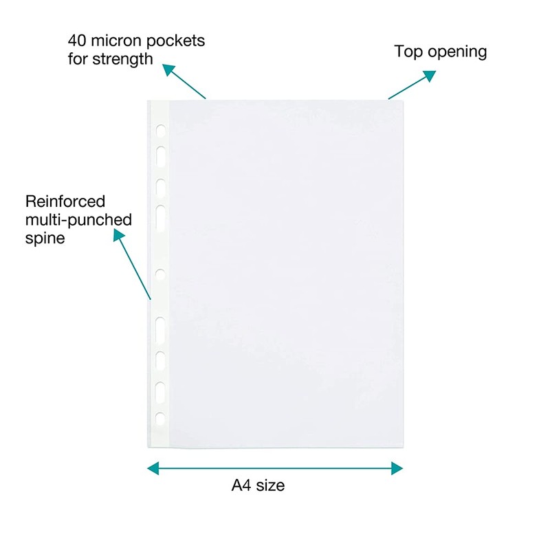 Protect documents with this pack of 150 embossed punched pockets. Made from strong polypropylene with a reinforced spine to support it when filed in a ring binder or lever arch file. Ideal for storing and protecting loose sheets.