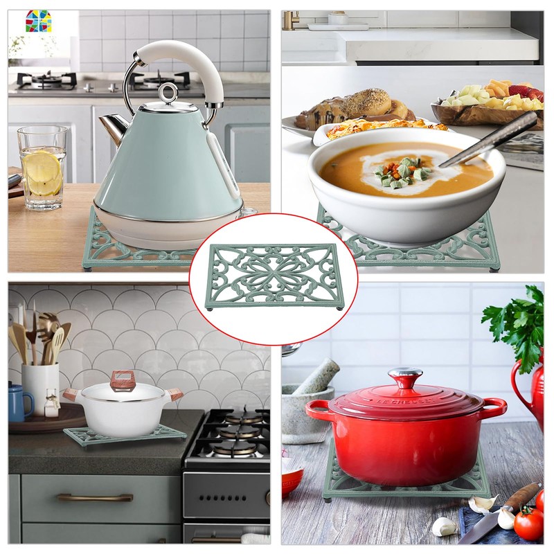 - High Quality - Functional trivet is made of high quality cast iron material with green finish, it's sturdy and solid for long-lasting use, and no worry about that it will break or rust easily; The rubber feets of the trivet are cushioned, so it won't slide and scratch your countertop.