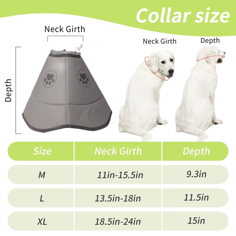 • WARM REMINDER : ①Measure your dog’s neck circumference and nose to neck length before buying. M : Neck Circumference 11’’-15.5’’,Depth 9.3’’,L : Neck Circumference 13.5’’-18’’,Depth 11.5’’ ,XL: Neck Circumference 18.5’’-24’’,Depth 15’’.②Make your dog feel comfortable and relaxed before wearing dong cone. Adjust the tightness to ensure that the dog can breathe and move freely. Avoid pressing or tightening to prevent your dog from becoming resistant.③Check the condition of the cone regularly to ensure that there is no damage or distortion, keep the cone dry to prevent moisture from causing bacterial growth