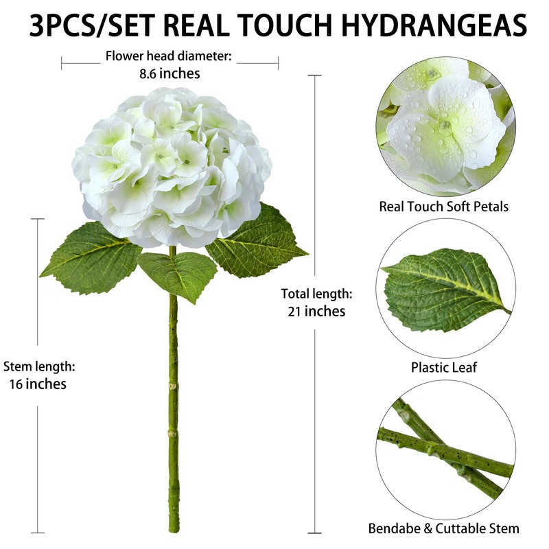 - Dimension & Package : Total length: 21" , the diameter of flower head: 8.6'' ; Package : 3 Pcs White Macrophylla Hydrangeas ( Vase not included)