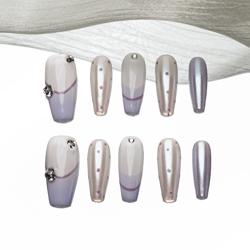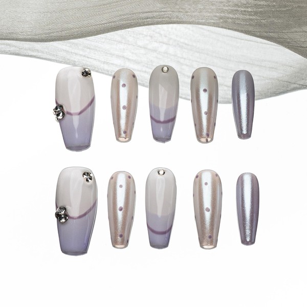 Sun&Beam Nails Handmade Nail Tip, Medium, Long, Coffin Ballerina, Skin Tone, Irregular, Gold, False Nails, Simple, Stone, Dot Design, Stylish, Set of 10 (#182 L)