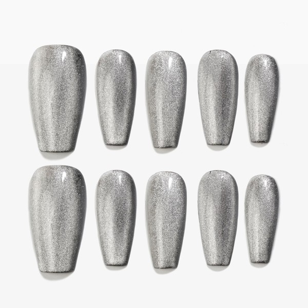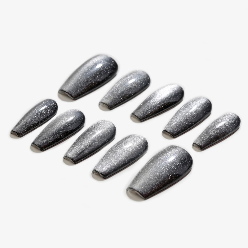 Sun&Beam Nails Handmade Press-On Medium Long Coffin Ballerina with Silvern Black Cat Eye Design Charm Cute False Nail Tips 10 Pcs (#105 L)