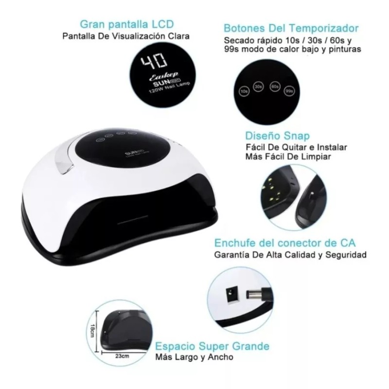 Características: con luz LED, secador de esmalte de uñas, doble fuente de luz, temporizador