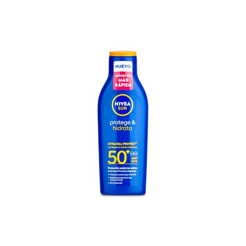 - LIEFERUMFANG - NIVEA SUN Protect & spendet Feuchtigkeit Sonnenmilch FP50+, wasserfester Sonnencreme, Citracell-Protect Formel, 48 Stunden Feuchtigkeit, 1 x 200 ml, Flasche