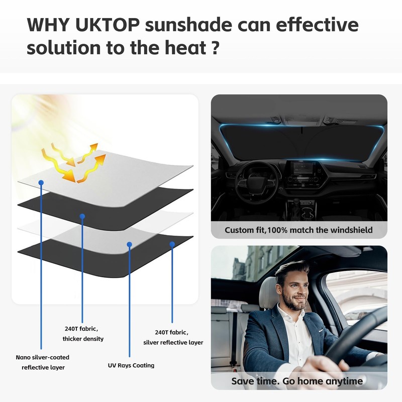 - 【The latest upgrade】The windshield sun shade is made of 240T fabric with a thicker density, Nano coating, 4 anti-UV layers, and better reduce of the heat and UV rays.Double D-shaped steel ring design, So useful is the sunshade that allows you to enter the car easily.