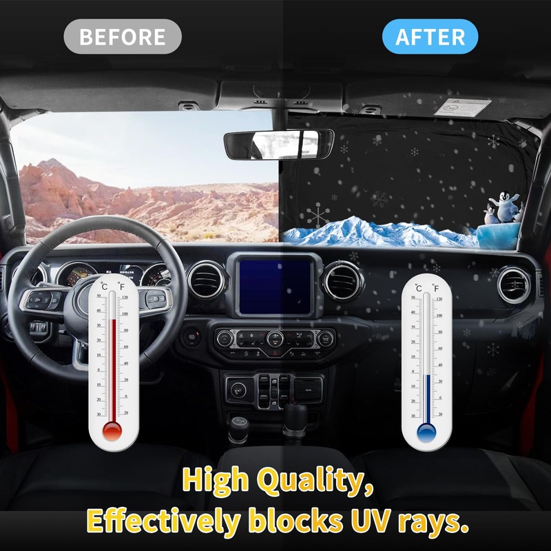 - 【UV Protection】The windshield sun shade cover is made of high quality polyethylene (HDPE) microfiber,4-layers cover blocks 99.79% of UVA & 99.95% of UVB And SPF100 & UPF 50+.Provide a cool environment and comfortable rest.