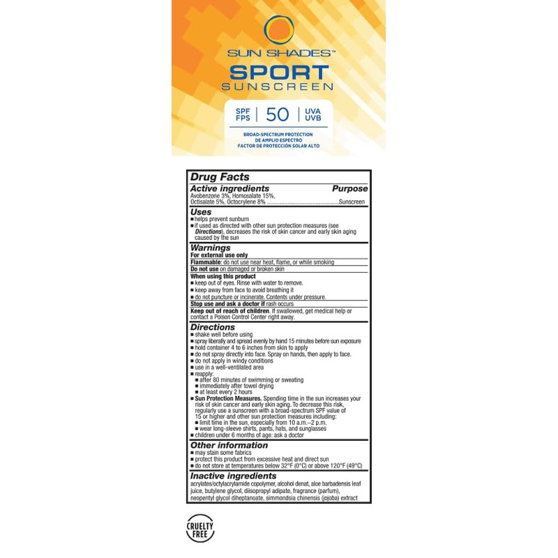 New - Water-resistant - Sun Shades Sport SPF 50 Continuous Spray Sunscreen, 5.5 fl oz - protects against harmful UVA and UVB sun rays with quick and complete spray-on coverage, to protect your skin against the signs of aging.