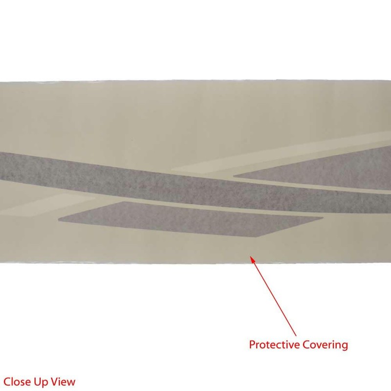 This decal is constructed out of metallic gold and white vinyl with adhesive backing. It measures approximately 138" W x 11" H overall.