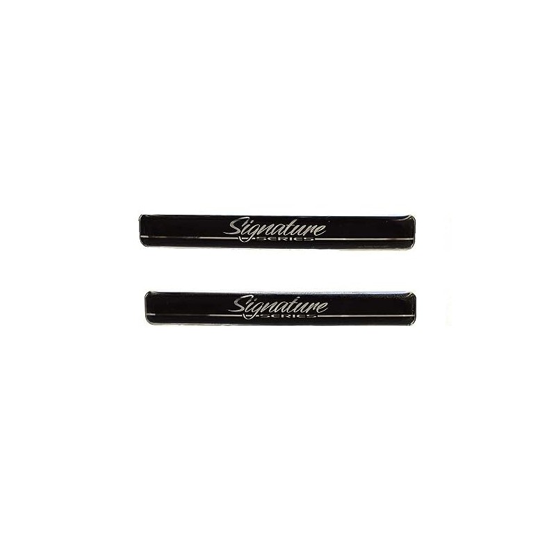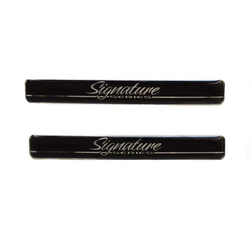 These decals are constructed out of black and silver colored foam filled vinyl with a glossy finish and adhesive backing. They each measure approximately 3 3/4" L x 1/2" H overall.