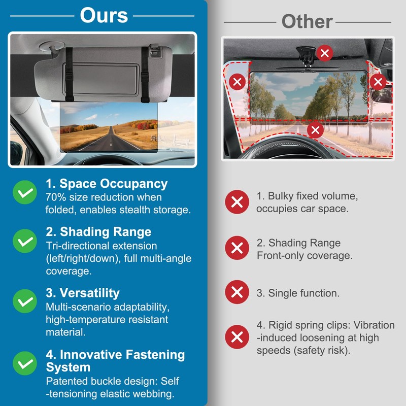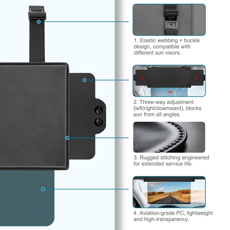 - 【True Universal Fit with Zero Visual Obstruction】 Rigorously tested on 500+ models (sedans/SUVs/trucks). Patented adjustable buckles accommodate OEM visor thicknesses. Downward visor extender: 10.55in(L) x 4.40in(W), side visor extender: 4.7in(L) x 4.25in(W).