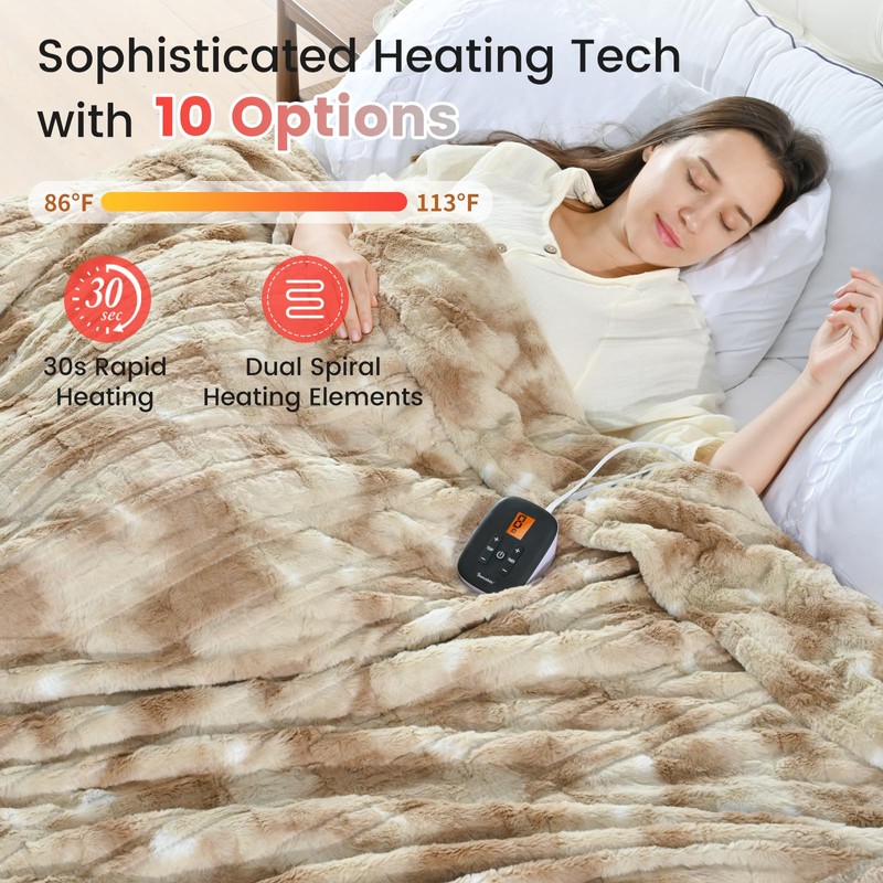- Fast and Even Warmth:The Sunable heated blanket throw has 10 heating levels (86°F - 113°F),and the electric blanket has built-in efficient micro-thin heating wires, controlled by just one button, Set the auto-off from 0.5 to 12 hours in 0.5-hour increments. The blanket features a 19-foot long cord for added convenience.