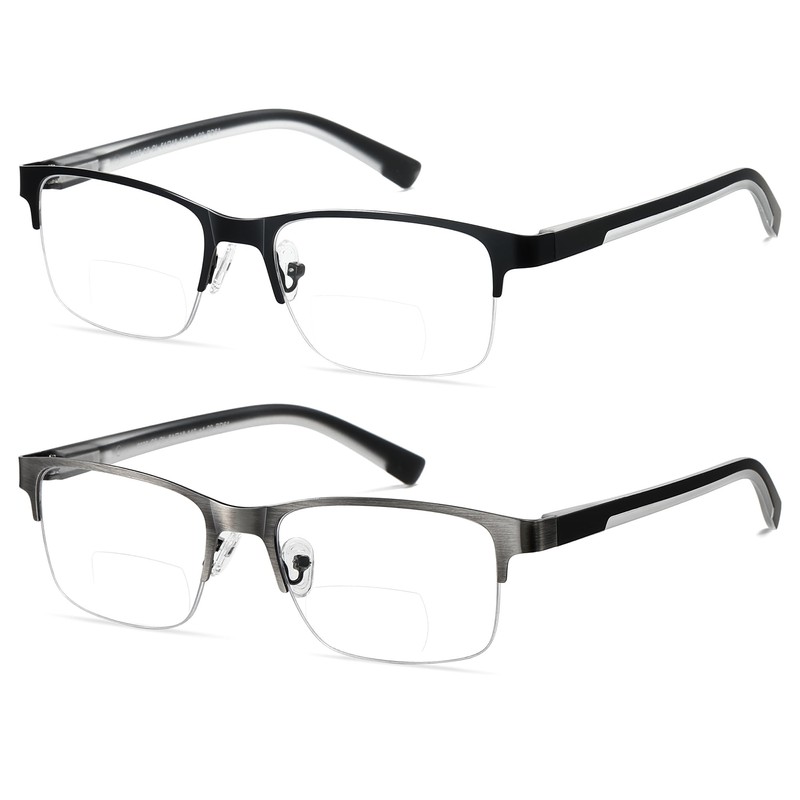 SUNAMOY 2 Pack Extra Wide Metal Clear On Top Bifocal Reading Glasses Men, Half Frame Spring Hinge Computer Blue Light Blocking Bi focal Readers Anti Eyestrain/Glare/UV 2.0