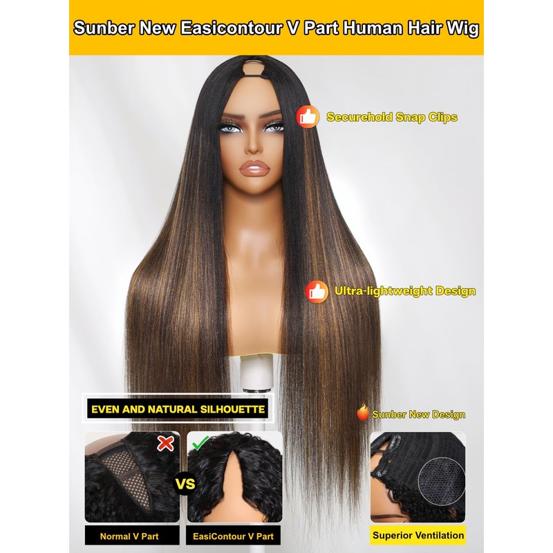 - Easicontour V part ombre highlight yaki straight wig with drawstring : Sunber new upgrade Easicontour v part ombre brown highlight yaki straight wig,magic v-line with seamless edges that creates a seamless and realistic hairline, pre-crocheted flatten smooth ,natural hair-like texture.