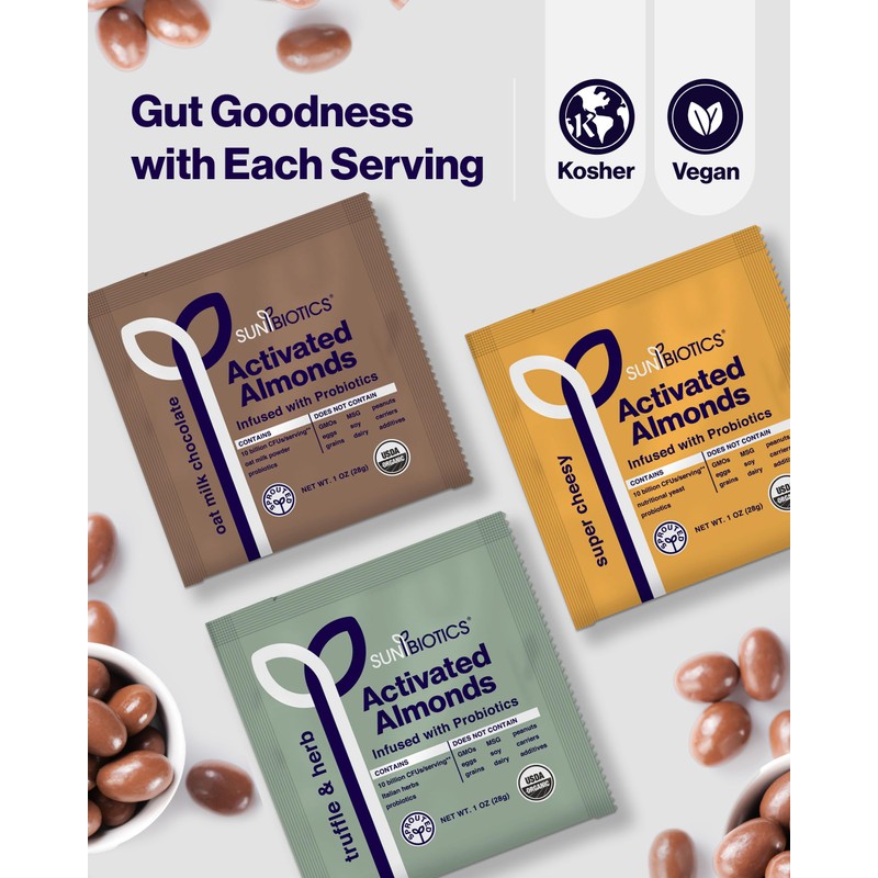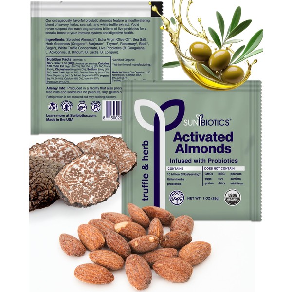 - Our crunchy raw truffle almonds with probiotics are made with ingredients by Sunbiotics. It's USDA Organic, Non-GMO, vegan, gluten-free, soy-free, flour-free, and dairy-free.