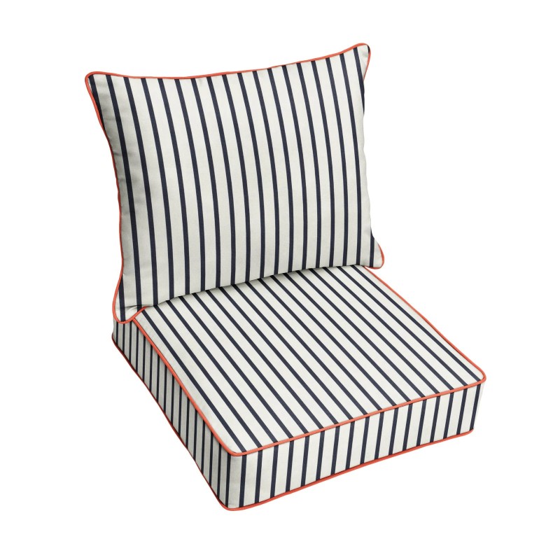 This stylish and comfortable chair set is perfect for any interior or exterior seating area. Featuring a blue and white striped upholstery with contrasting melon cording, this set includes a seat cushion and back pillow filled with 100% recycled polyester fiber, allowing for a comfortable and supportive sitting experience. Plus, this set resists damage from UV fade, sun exposure, water and mildew, making it perfect for any setting.Features: Striped upholstery in blue & white Melon cording trim 100% recycled polyester fiber fill UV fade & sun exposure resistant Water & mildew resistant Proudly made in North AmericaAdditional Details: Imported Care Instructions: Spot clean only