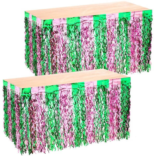 Suncalla 2 Pack Pink and Green Party Decorations Witch Party Table Skirts 30 x 108 Inch Wavy Metallic Tinsel Foil Fringe Table Skirts for Rectangle and Round Table Birthday Witch Decorations