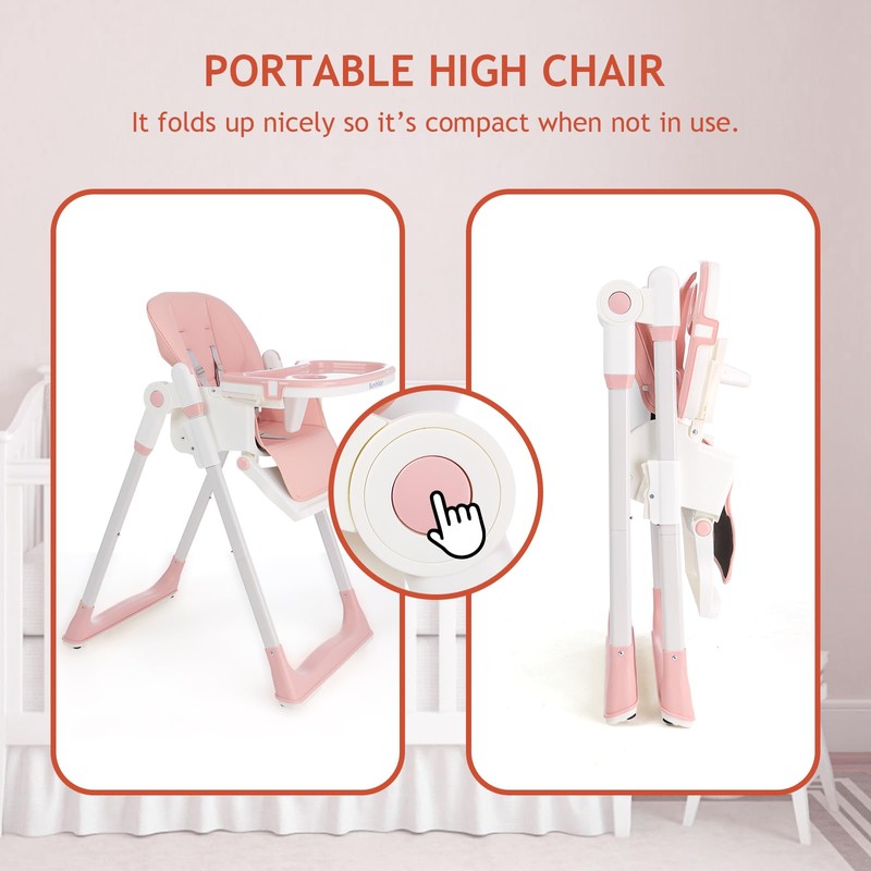 Sunchildor 3 in 1 Baby High Chair with Wheels, Adjustable 5 Point Harness, Tray, Foot Rest, Backrest and Seat Height, Foldable High Chair for Toddlers, Pink