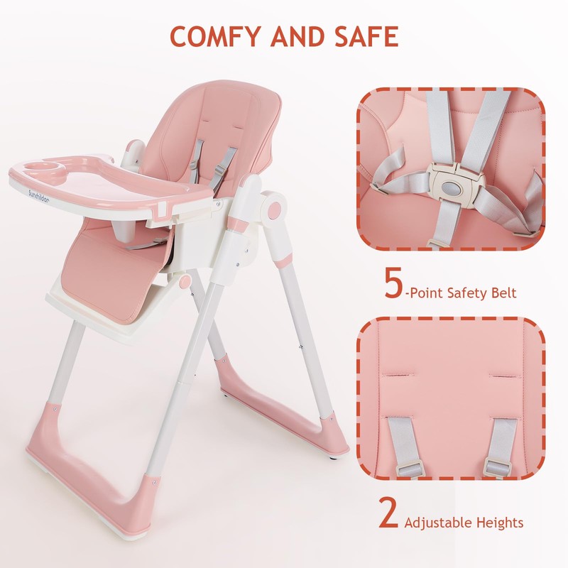 - Safe and Comfortable High Chair: This high chair features an adjustable seat belt and sturdy construction, and its 5-point harness has 2 adjustable positions, and you can adjust the position of the straps according to your baby's actual needs to seek maximum comfort.