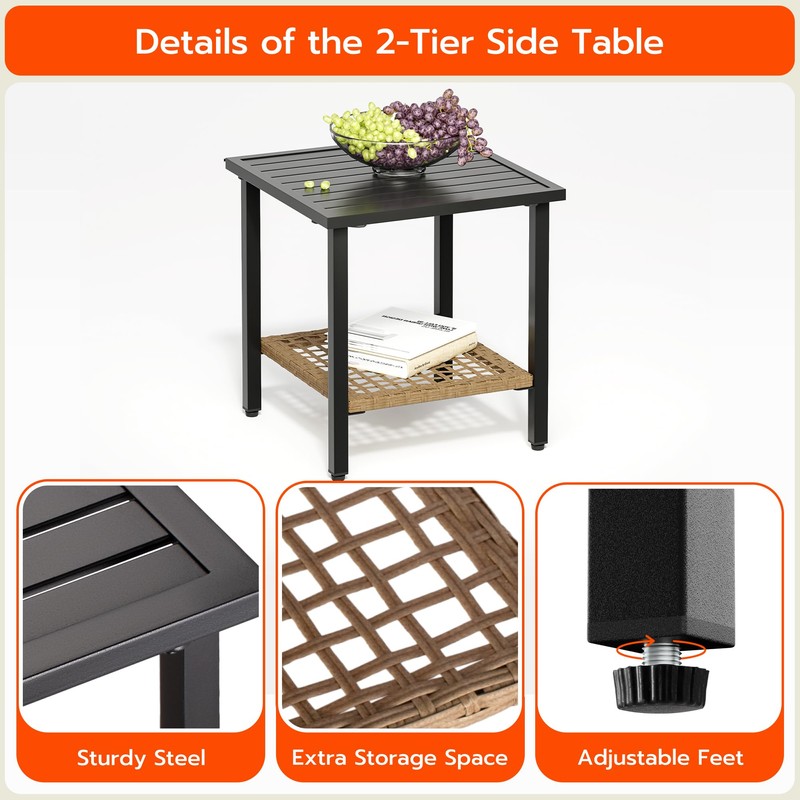 - THOUGHTFUL DESIGN-The coffee table of the 3pcs patio set features a metal frame design for easy cleaning. Its surface also displays a striped design pattern, enhancing aesthetic appeal, while the addition of a second-tier rattan space is ideal for magazine storage. Moreover, the table is equipped with adjustable feet under the chair legs to suit any place. storage. Moreover, the table is equipped with adjustable feet under the chair legs to suit any place