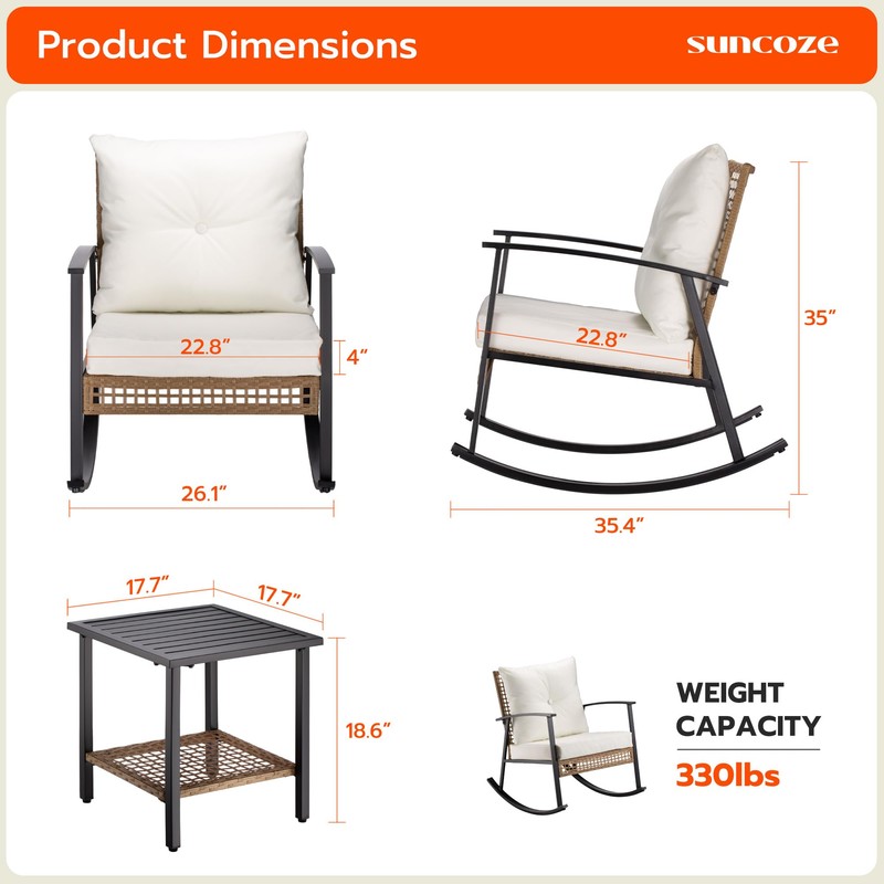 - 30° ROCKING AMPLITUDE & NON-SLIP DESIGN - The SUNCOZE patio bistro set comes complete with anti-toppling block features and non-slip rubber strips at the base to maintain safety while allowing your body to fully stretch and relax. Our outdoor rocking chairs with a 30° rocking angle offer a larger rocking amplitude compared to others. This outdoor patio set is a great addition to yard, sunroom, by the pool, or in your backyard